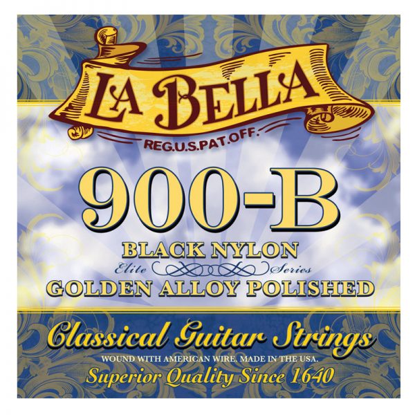 El juego de cuerdas para guitarra clásica y flamenca La Bella 900-B Elite se compone de primas de nylon negro y bordones pulidos dorados